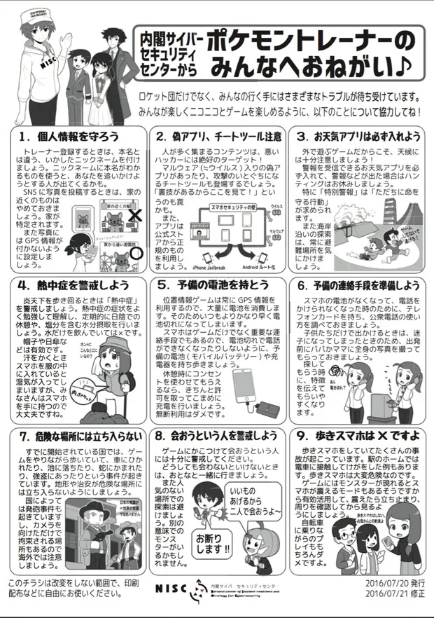 日本国家网络安全事件准备和战略中心通过美联社这份传单是相当文字密集的,但可爱的角色引导潜在用户了解一些最重要的安全预防措施。有些是常识。例如,第1条建议用户通过使用昵称和隐藏他们的即时位置来保护个人信息。第7和第8条警告用户要注意周围环境—不要进入危险区域,也不要与可疑陌生人见面。