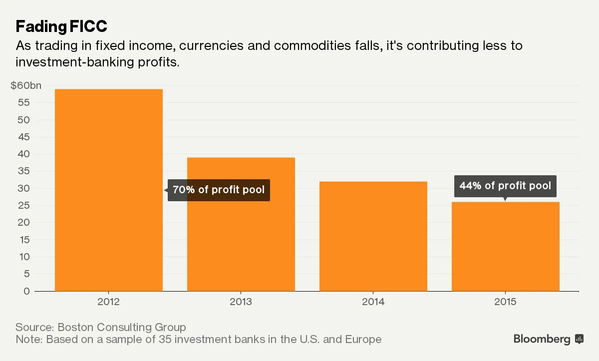 因此,交易大厅的活动减少。根据波士顿咨询集团的数据,自2012年以来,固定收益、货币和商品交易(行业术语称为FICC)的全球利润下降了56%,降至260亿美元。研究公司Coalition Development表示,在过去五年中,每三名债券交易员中就有一名被解雇。这一严酷现实正在将一个重视冒险的“吃肉文化”转变为一个谨慎和多疑的文化。
