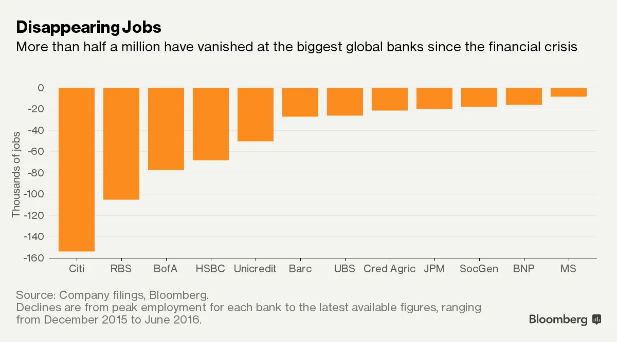 这对一个曾希望危机后的清算即将结束的行业来说是个令人沮丧的消息。在过去的八年里,金融行业的男女员工一直在防守。自2008年以来,全球最大的银行中已有超过50万个工作岗位消失,彭博社的数据表明。顶级对冲基金和资产管理公司正在降低费用并裁减员工以保持竞争力。