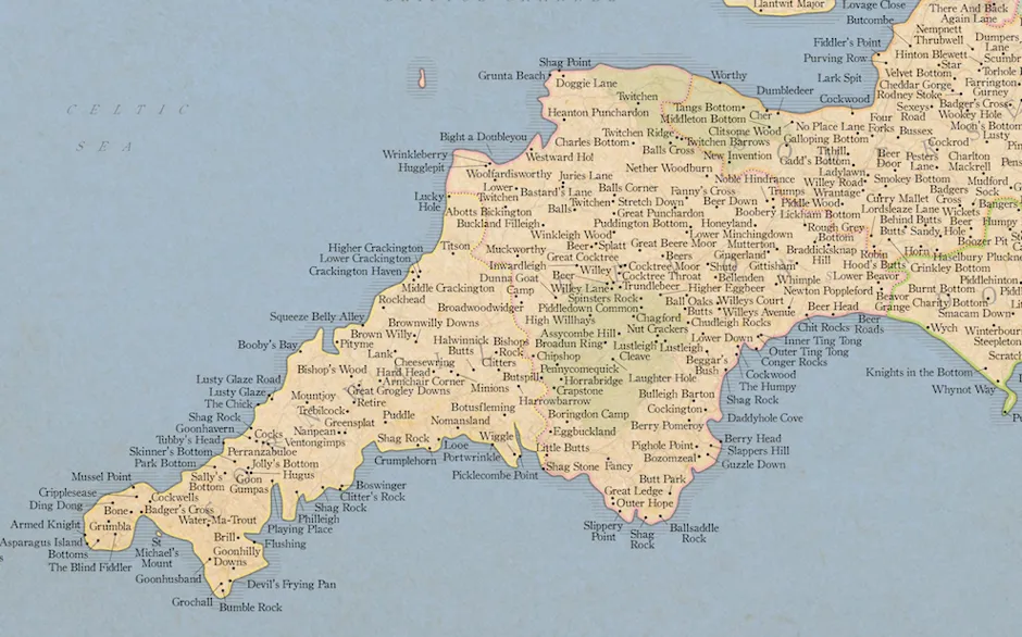 西南英格兰的特写来自ST&G的经典地图ST&G奇妙地图范妮·巴克斯,利克斯巷,科克普莱山,以及后面的小丘——无论是谁给大不列颠起了这些更具暗示性的地名,肯定有着丰富的想象力。这个岛长期以来以拥有数百个村庄、山峰、河流和小巷而闻名,这些地方的名字奇特,甚至有些粗俗。现在,英国公司ST&G奇妙地图将它们全部汇编在一张广阔的墙面地图上。