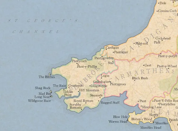 西威尔士是一个不太可能的名字的盛宴。ST&G 奇妙地图当然,事实是这些地名从来没有意图显得粗鲁。当这些地方首次建立或命名时,它们的名称无疑是合理的。自那时起,由于语言的变化,它们变得粗鲁:这些古老的地名即使在日常用语中早已不再使用,仍然保留着。