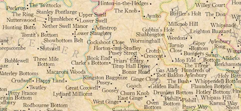 这张地图确实揭示了英国许多不太可能的地名的更喧闹的一面。有些名字粗俗得几乎不再是双关语了。当我问路去德比郡的女士洞、汉普郡的裸体男或——证明动词也可以是名词——格洛斯特郡的狩猎小丘时,我可能会脸红。坎布里亚的鸡母和林肯郡的基本渣土路听起来像是早期严重的羞辱,而只有那些对我们的毛茸茸朋友爱得有些过分的人,才会给一个地方起名为獾谷。不过,因为我有一个容易暗示的头脑,我实际上对这些名字的困扰程度,远不及肯特的主教污垢带来的隐晦不适。