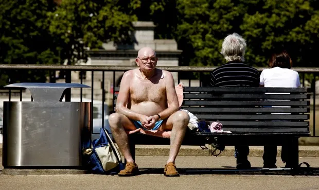 2007年8月热浪中的一位赤膊伦敦人。路透社/凯文·库姆斯对我们中的一些人来说已经太晚了,但抵御热病的最佳防御是健康年轻的心血管系统、充足的水分和大量的汗水。老年人对长期热的影响 更加脆弱:衰老的心脏在实现热调节所需的增加血流时会感到压力,老年人出汗也更少。