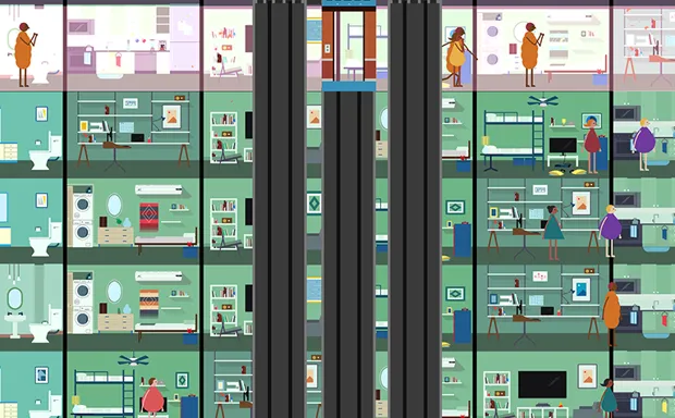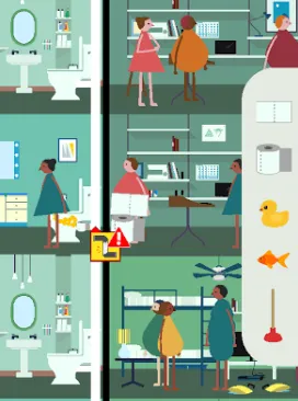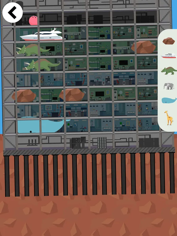 那种沉没的感觉。Tinybop通过几次轻轻的滑动和点击,用户可以“创造”一个虚构的摩天大楼,添加楼层并选择外立面的颜色。在应用程序的侧边栏中,选择一个小型I型梁按钮来玩一个游戏,在这个游戏中,添加巨石、大象和帆船会让你的建筑深深地倾斜并沉入基础中。一个电梯图标带你进入一个互动的内部生活视图——家庭在厨房里、看电视、踮着脚走过卧室。细节非常华丽,尤其是在另一种模式中,通过点击一个小水滴进入,在那里你可以堵塞厕所并在不同楼层上点火。观察建筑(它被赋予了拟人化的特征)如何反应。他们说如果墙壁会说话……