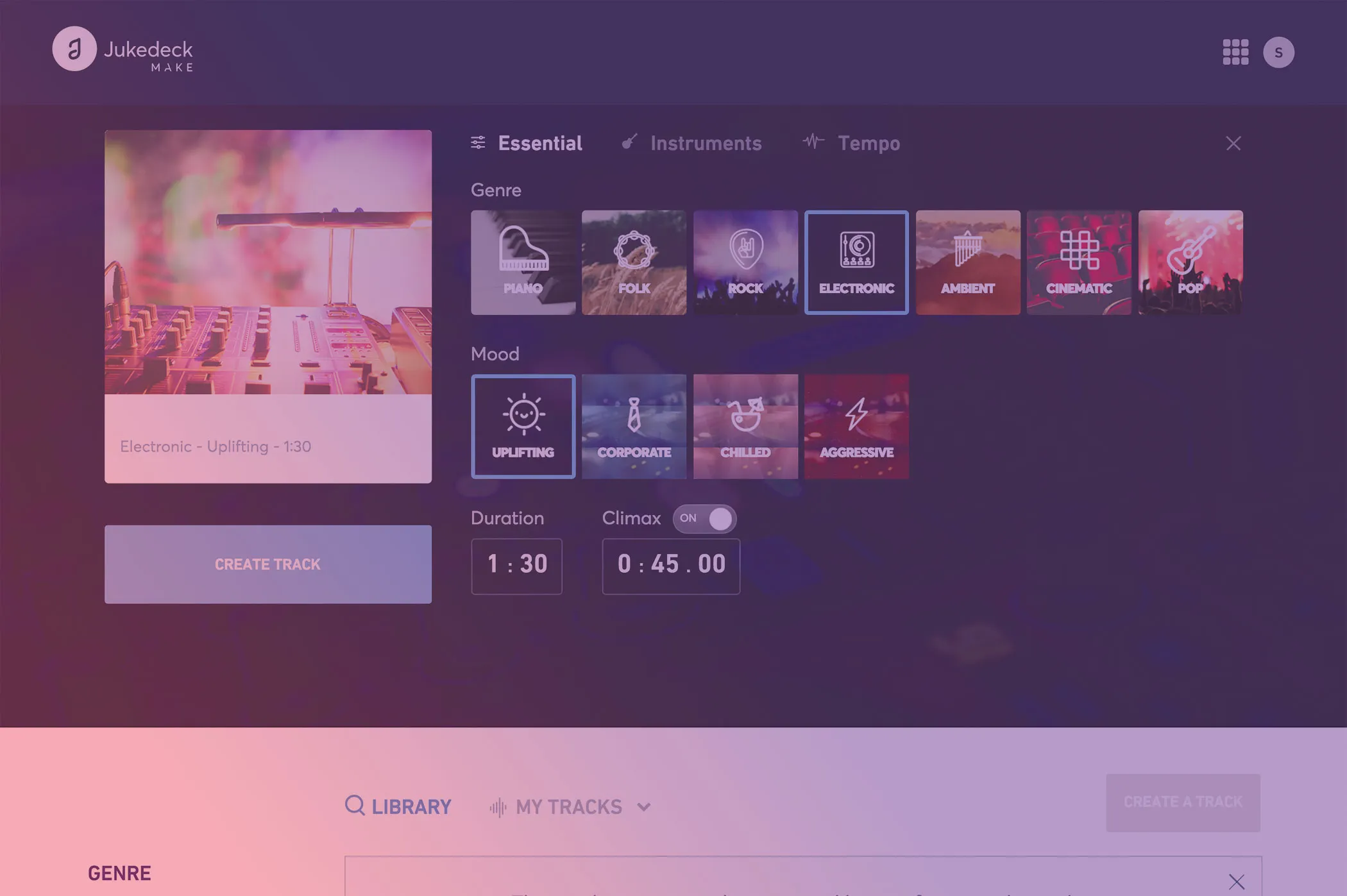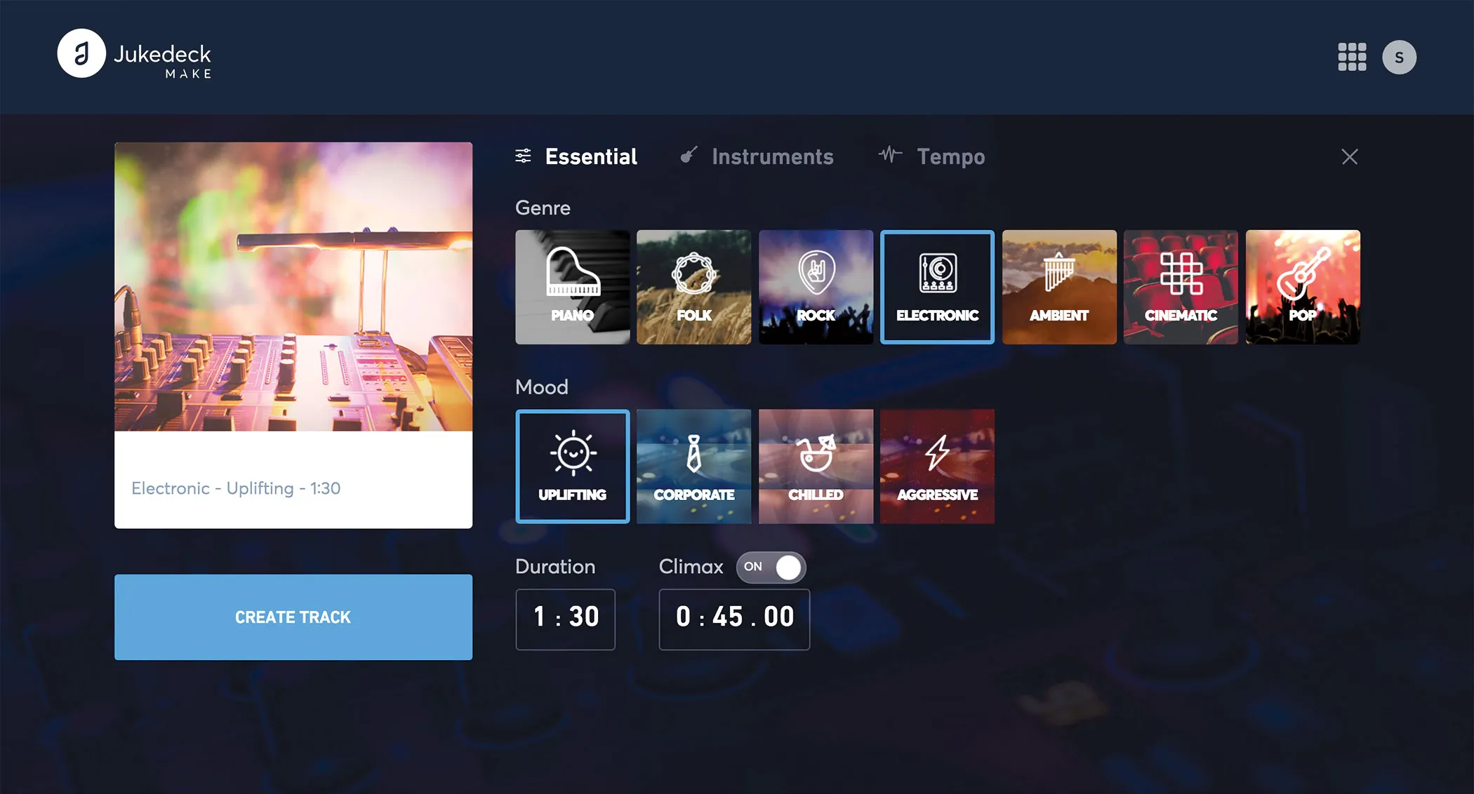 Jukedeck界面提供了许多音轨混合的选项。版权所有:Jukedeck歌曲创作在Jukedeck的网站上,用户选择歌曲的长度、类型、节奏和其他特征;软件在几秒钟内生成一首完成的作品。