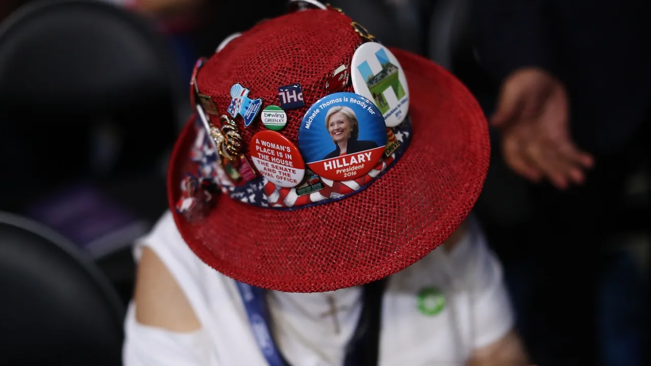 一名与会者在2016年7月25日的费城民主党全国大会上佩戴着支持希拉里·克林顿的红色帽子和竞选按钮。