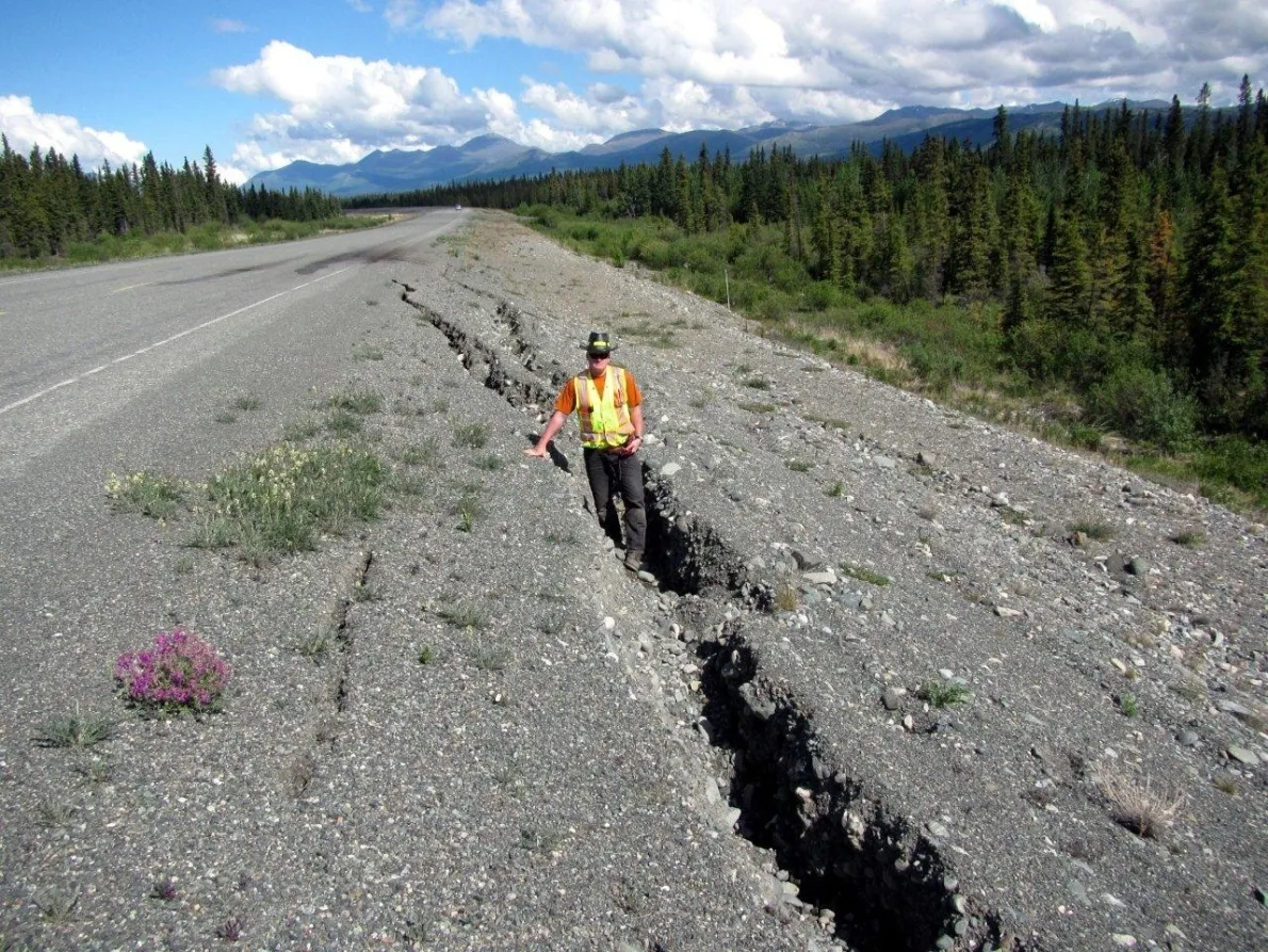 保罗·默奇森,育空省公路和公共工程部交通工程主任,站在因永久冻土融化而形成的裂缝内。
