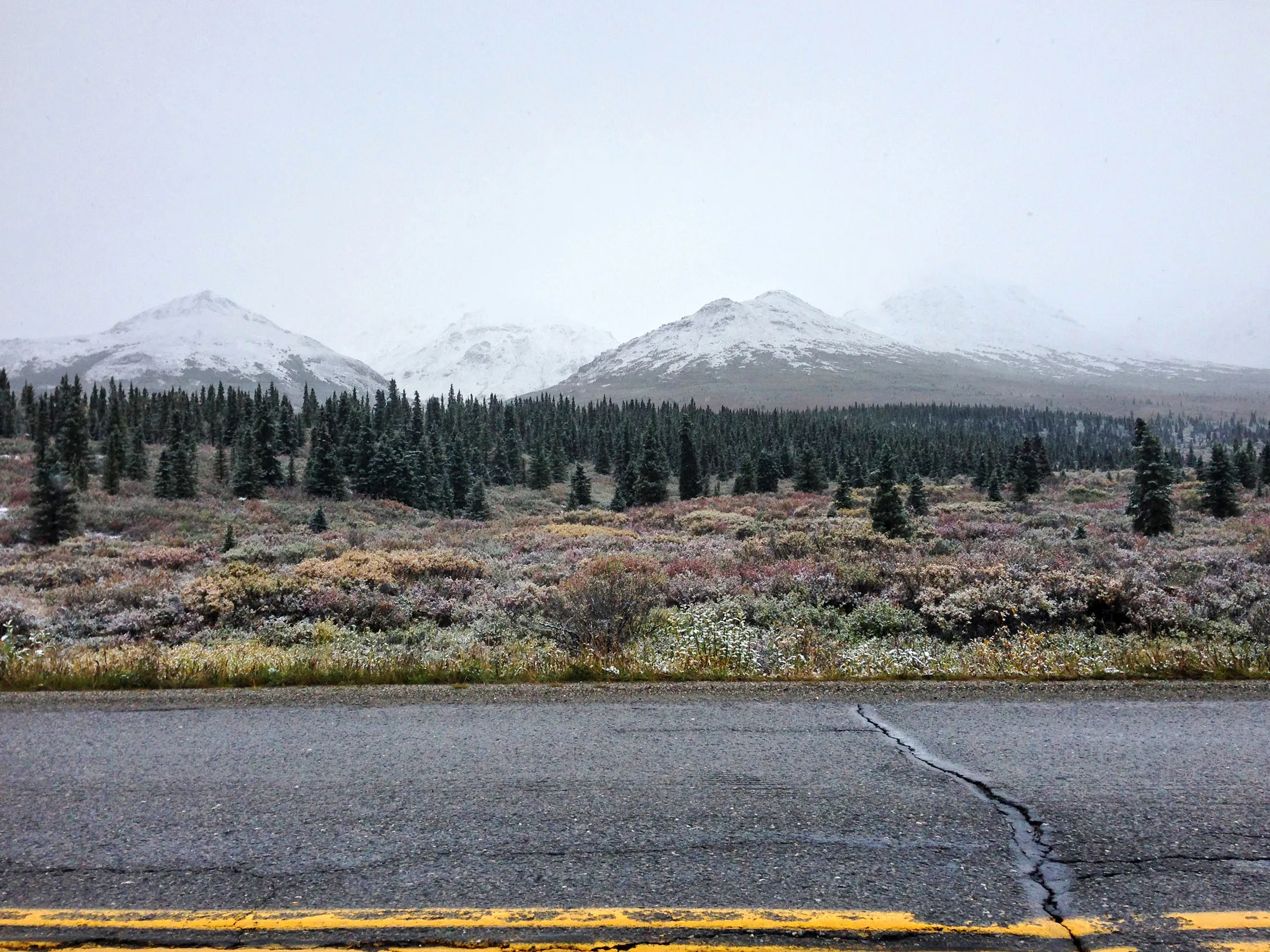 阿拉斯加公路沿线的雪山和常青树。