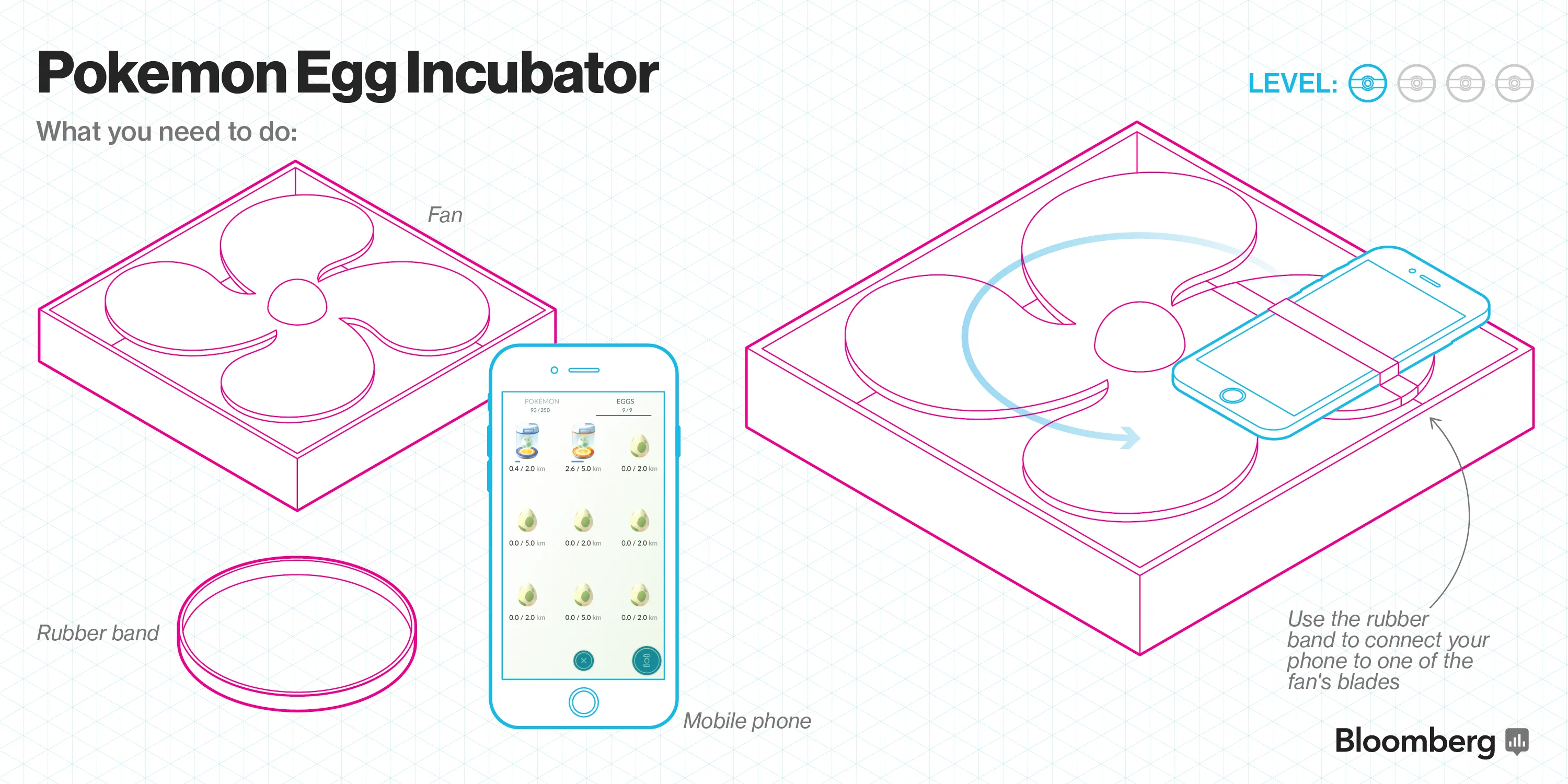 除了在野外捕捉怪物,口袋妖怪的饲养一个重要部分是从蛋中孵化它们。这需要实际步行,最高级别的怪物需要走10公里(6.2英里)。坐车甚至骑自行车似乎都不行,但用橡皮筋把手机绑在吊扇上就能解决问题。