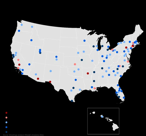 下面的地图显示了大都市的模式。深蓝色点表示就业增长最大;红色点表示下降最大。(此外,请查看 布鲁金斯的在线工具,以比较美国100个最大大都市区的先进产业产出和就业水平的子行业)。