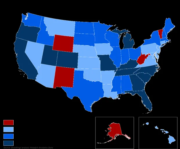 先进产业在50个州的增长非常不均衡。如上图所示,远西、东南部和中西部的部分地区在先进产业中取得了最大的增长,而怀俄明州、阿拉斯加州、新墨西哥州、西弗吉尼亚州和佛蒙特州则遭遇了最大的损失。