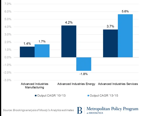 但并非每个先进产业都以相同的速度增长,或者说一定在增长。该行业的增长是可变的,且往往不足。如上图所示,先进服务——如计算机系统设计、网络搜索和互联网出版、软件产品、数据处理和托管、研发服务和咨询等高科技产业——在2013年至2015年间平均增长了5.6%。实际上,这一增长的主要部分来自一小部分与科技和汽车相关的先进服务产业。仅有七个单独的行业——三个与汽车相关,四个与数字服务相关——产生了三分之二的先进产业增长。在同一时期,汽车行业等先进制造业的平均增长率仅为1.7%。在全球能源市场下滑的背景下,石油、天然气和水力压裂等先进能源产业在2013年至2015年间平均下降了1.8%。