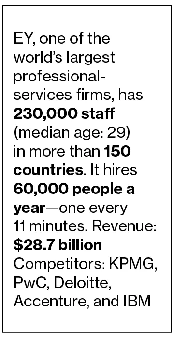 **许多首席执行官表示,他们最重要的工作之一是管理公司的人才。你对此有什么看法?**我对此充满热情。我们有近25万人,分布在150个国家。我们的员工中有75%是千禧一代,而EY员工的中位年龄——信不信由你——是29岁。 **哇,那真年轻。**人们认为我们是老旧、呆板的会计师。但我们是一个相对年轻的组织。在过去的几年里,我们每年招聘6万到6.5万人。所以我们可能是最大的招聘者之一,我们必须吸引这一新一代。