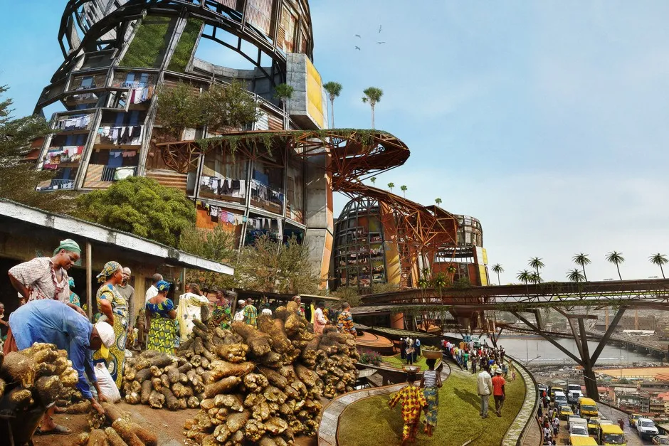 杰伊福斯使用基于拉各斯实际定居点的材料和建筑技术的3D计算机模型创建了他的“贫民窟巨型结构”,然后将其与照片融合。他受到尼日利亚裔美国作家 恩内迪·奥科拉福 的短篇小说 Binti 和 奇幻作家中国·米维尔的 《城市与城市》 深受启发。这个项目最初是为建筑比赛创建的,主要是概念性的:它“提供了一个关于一个大陆和一个国家的未来的替代愿景,而这个地方并没有得到应有的描绘,”杰伊福斯说。展望未来,杰伊福斯计划将这个虚构的世界作为互动游戏和虚拟现实体验的背景。