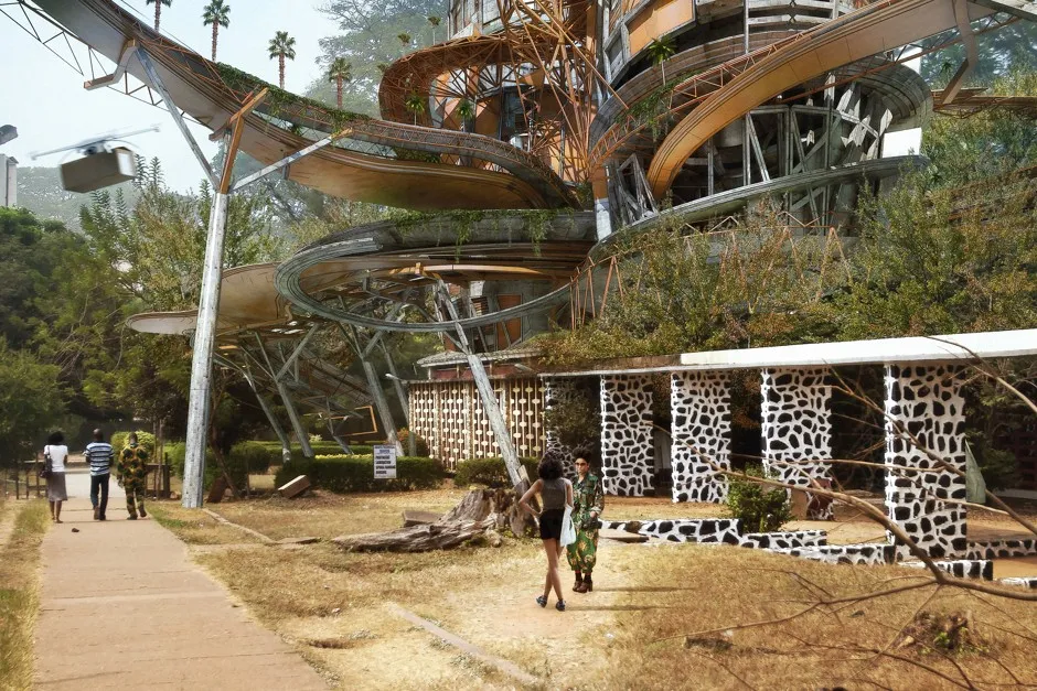他的新 摄影系列 旨在解决这个问题。在其中,他描绘了拉各斯的天际线,破旧的高楼从贫民区中冒出,旋转向天空。这些图像中的巨型结构是 布鲁斯·戈夫 风格的建筑类型混合体:它们看起来像是通过堆叠华盛顿特区标志性的 水门大厦 和孟买的苔藓 艺术装饰建筑,像婚礼蛋糕一样,层层叠加。每栋高楼似乎都充满了植物、人类、动物和机械部件,给人一种生机勃勃的感觉。每一栋都是一个繁茂且相互关联的城市生态系统中的主导生物,类似于未来主义艺术家 伦佐·毕卡索的草图。
