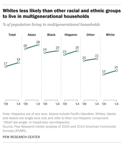 在整体人口中(包括外籍和美国出生的人),亚洲人和西班牙裔的增长速度快于白人,两者都倾向于偏好多代同堂的居住安排。2014年,28%的亚裔美国人生活在这样的家庭中,而西班牙裔和黑人为25%。白人的比例则显著较小,仅为15%: