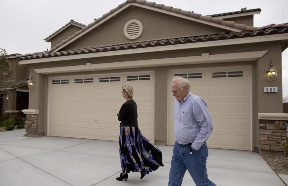 一对老年夫妇在内华达州拉斯维加斯看着一个多代同堂的样板房。朱莉·雅各布森/AP在2014年,更多年轻人 与父母同住 而不是与浪漫伴侣同住。而许多这些千禧一代的父母也与 他们自己的父母同住。