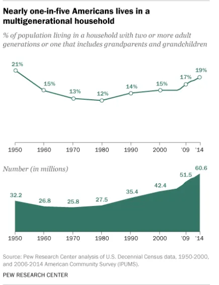 皮尤研究中心的一项新 分析 发现,创纪录的美国人——确切地说是6060万——在那一年与祖父母同住。在美国人口中,这些人占2014年19%。这几乎与1950年相当,当时21%的人口,或3200万人,生活在这样的安排中。