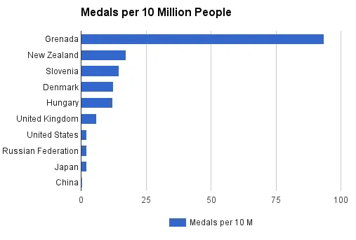 Mellander / Adler上面的图表考虑了人口规模,显示每1000万人获得的奖牌数量。现在,微小的格林纳达占据了首位。它的一枚奖牌相当于每1000万人获得93.6枚奖牌。新西兰以17.4名列第二,斯洛文尼亚以14.5名列第三,丹麦以12.3名列第四,匈牙利以12.2名列第五。还有四个国家——中华台北(11.5)、斐济(11.2)、牙买加(11.0)和立陶宛(10.3)——每1000万人获得的奖牌超过10枚。(在某些情况下,这些数字高于这些国家迄今为止的实际奖牌总数,因为它们的人口低于1000万)。美国降至第36位(2.15枚奖牌),俄罗斯现在排在第38位(2.08枚),中国降至第60位(0.32枚奖牌),