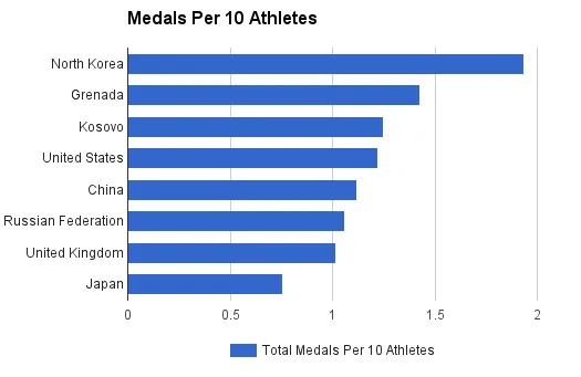 梅兰德 / 阿德勒我们还可以控制国家奥林匹克团队的效率,计算每位奥林匹克团队成员的奖牌数。北朝鲜以每十名奥林匹克团队成员1.93枚奖牌位居首位;格林纳达以1.43枚排名第二;科索沃以1.25枚排名第三。但现在美国上升到第四,达到1.22。中国以1.12排名第五,俄罗斯以1.06排名第六。英国以1.05排名第八,日本以0.76排名第十四。这可能是最有用的指标,因为它显示了哪些国家在每位奥林匹克团队成员中产生奖牌的能力最佳。