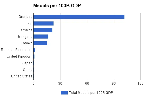 格林纳达(每1000亿美元GDP-PPP 71.4枚奖牌)、北朝鲜(15)、斐济(12.4)、牙买加(12.2)、科索沃(5.8)、格鲁吉亚(5.6)和蒙古(5.5)。