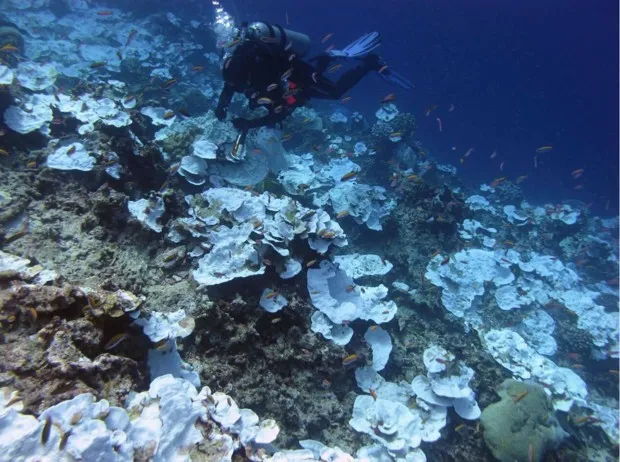 一名潜水员在太平洋偏远岛屿海洋国家纪念碑附近的五月调查一个漂白珊瑚的墓地。NOAA/贝尔纳多·巴尔加斯-安赫尔/AP世界的海洋正处于第三次记录到的、也是已知的最大规模的 大规模漂白事件,这是一种极端温度使珊瑚变得粉白并最终死亡的现象。