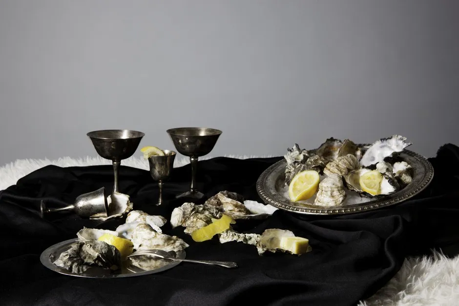 这些场景看起来美味而奢华。光线在苹果和梨上闪烁,映衬在哑光背景上;生蚝看起来鲜嫩可口,散落在白色毛皮上。镀金托盘、翻转的烛台和华丽的水壶的存在传达了这食物值得特别对待——它不应该被随意丢弃。