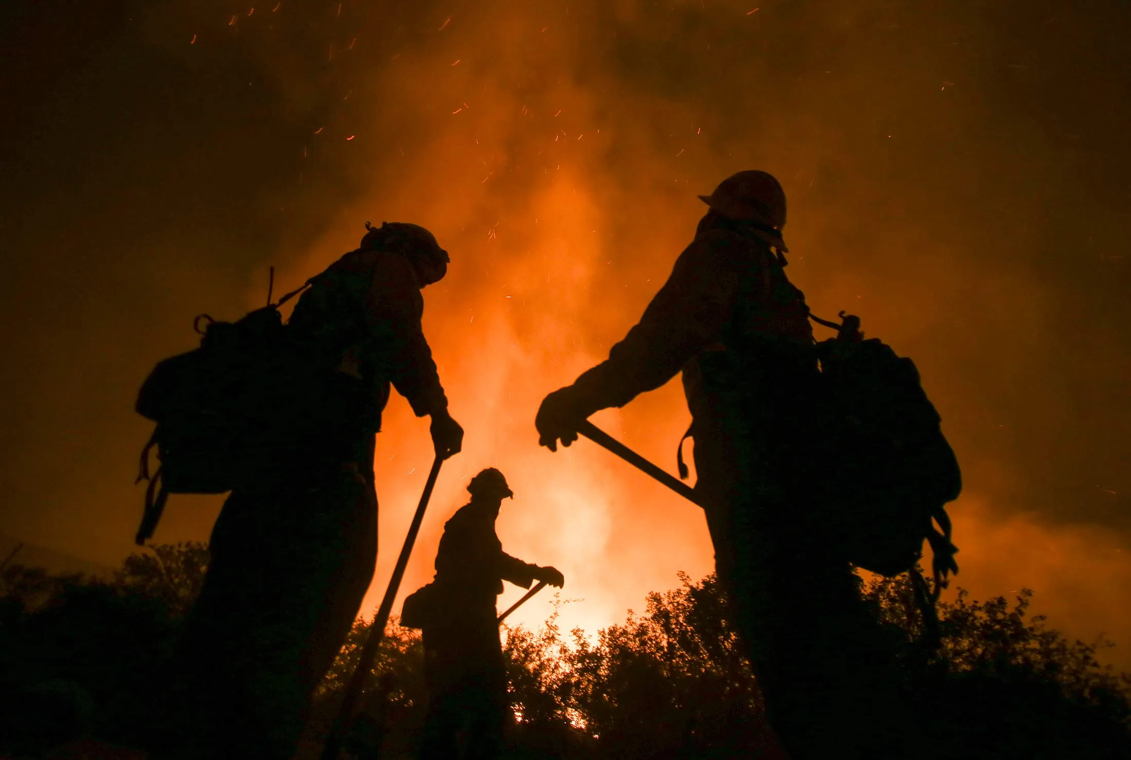 消防员在2016年8月16日于加利福尼亚州圣贝纳迪诺北部的卡洪口附近与蓝切特野火作斗争。