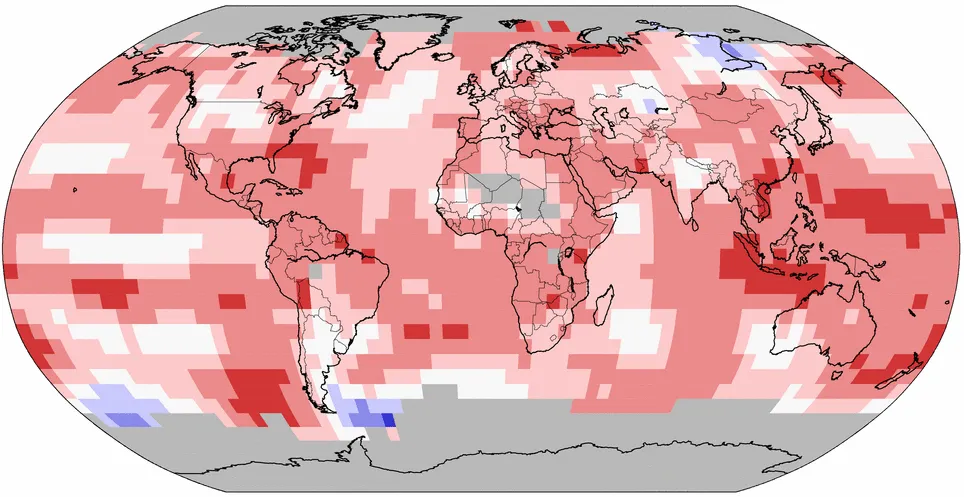 下面的互动图表显示了自1880年以来,按陆地和海洋测量的地球变暖气候。