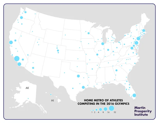 上面的地图显示了美国奥运选手的“家乡”。在波士顿-纽约-华盛顿走廊、北加州和南加州、南佛罗里达、芝加哥和德克萨斯州等地有明显的聚集,符合美国最大的城市人口中心。