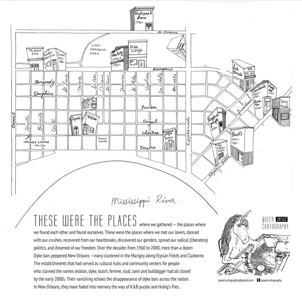 新奥尔良所有已关闭女同性恋酒吧的地图。酷儿制图/最后呼叫“我们需要存在的空间,社交的空间,组织的空间,真正做自己的空间,”米切尔说。在老一辈人讲述的最后呼叫播客故事中,几十年前的女同性恋酒吧就是这样的地方。在一个 专门讲述查尔琳酒吧的节目中,该酒吧从1977年到1999年在伊利西安田开放,前常客艾伦·拉宾说,酒吧老板“给人们带来了他们最大的快乐,因为他们有地方可以去。”警察突袭和人行道上的暴力围绕着酒吧,但在里面,它们是安全的避风港。另一位常客说,走进查尔琳酒吧就相当于说“我在这里,你不能打扰我。”