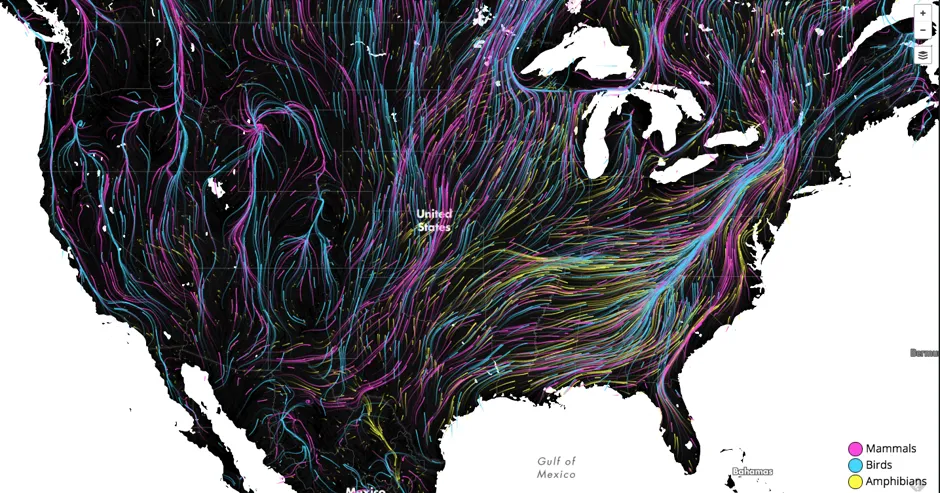 该地图基于一项 2013年的研究,该研究考察了气候模型和人类对景观的改造数据,以预测2903种脊椎动物在北美和南美的迁移。研究人员绘制了每种物种迁移路线的方向,以避免受到人类严重影响的区域。