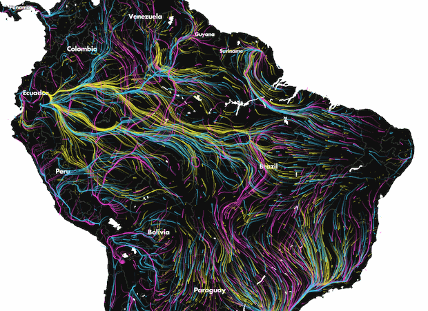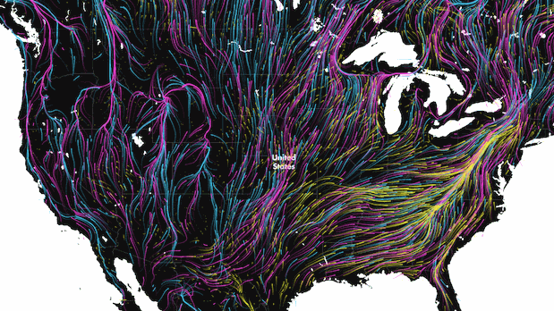 “遵循他们的脚步,我们认为这可能是可视化大量方向数据的一个引人注目的方式,”Majka 在给 CityLab 的电子邮件中说道。结果是一个极其详细的动物迁徙模拟,展示了北美和南美的动物迁徙,线条在各个方向上蜿蜒而行。