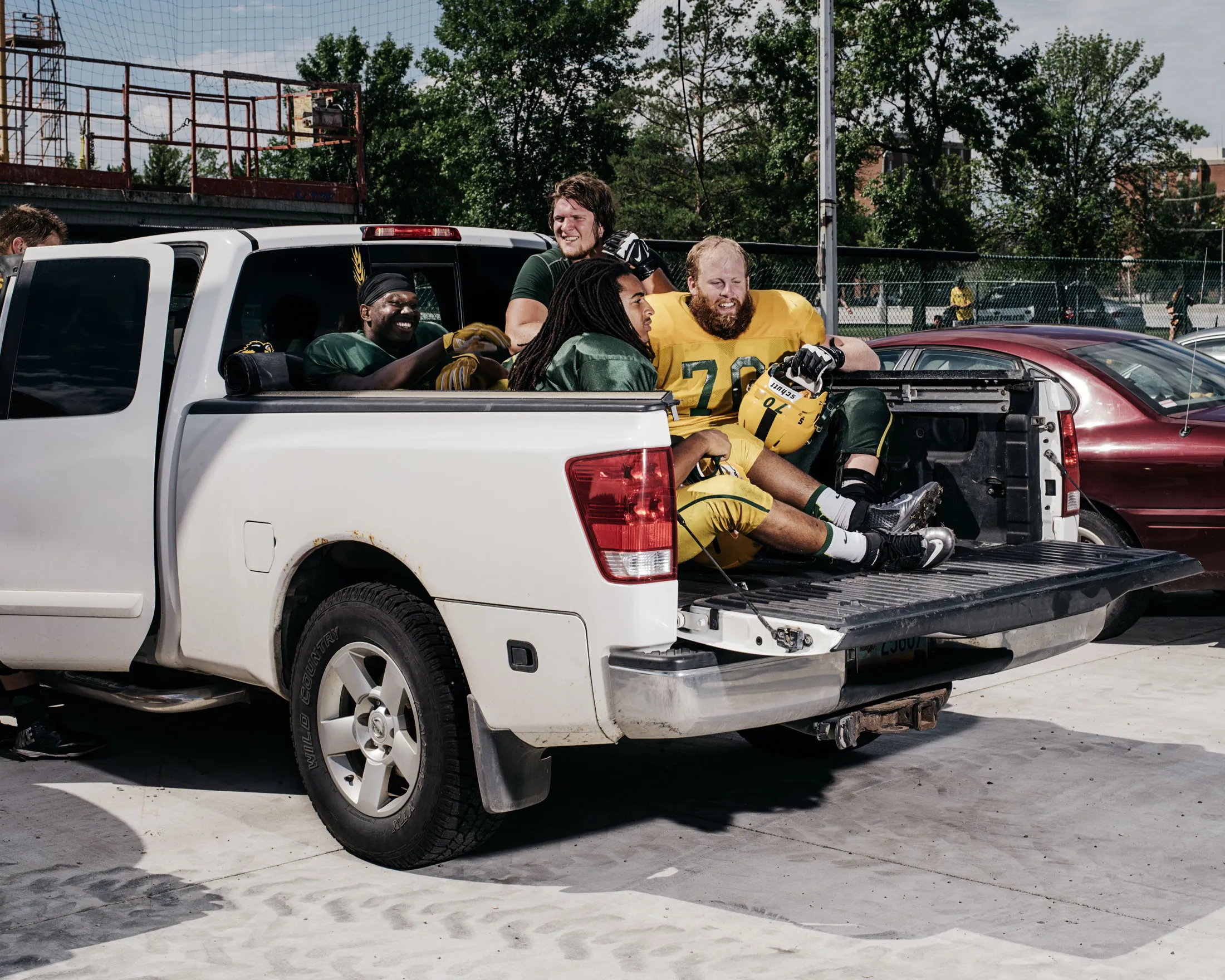 NDSU球员在8月的训练营期间在一辆皮卡车上休息。