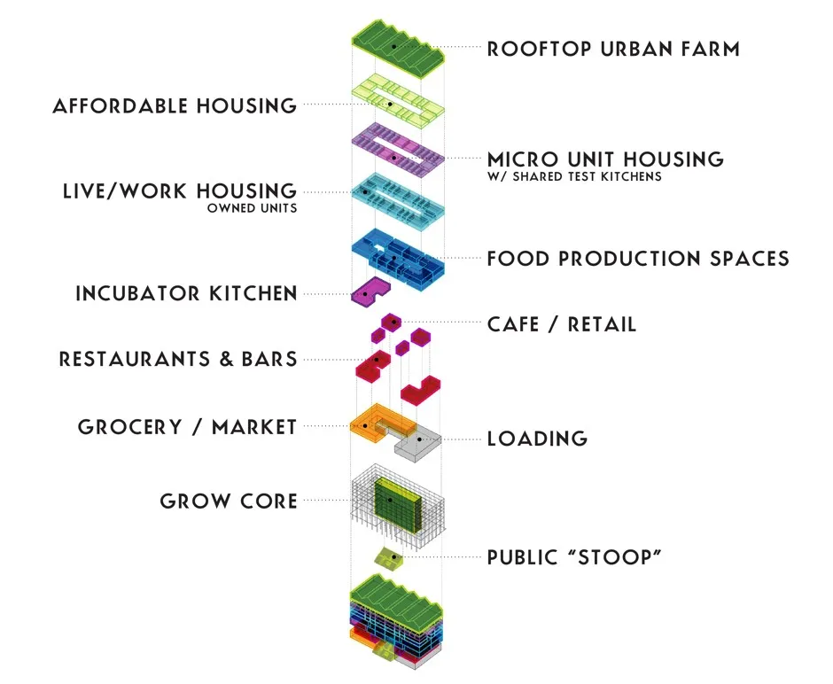 移动事物艾米莉·阿登·威尔斯和扎卡里·史蒂文斯设想了一个城市景观,在这个景观中,小批量的面包师从床上爬起来,爬上屋顶去采摘新鲜的蓝莓,或者黄瓜可以在几分钟内从藤上进入盐水浴。然后,松饼和腌菜可以沿着几层楼梯下到街边咖啡馆,或者装进卡车运往市场。