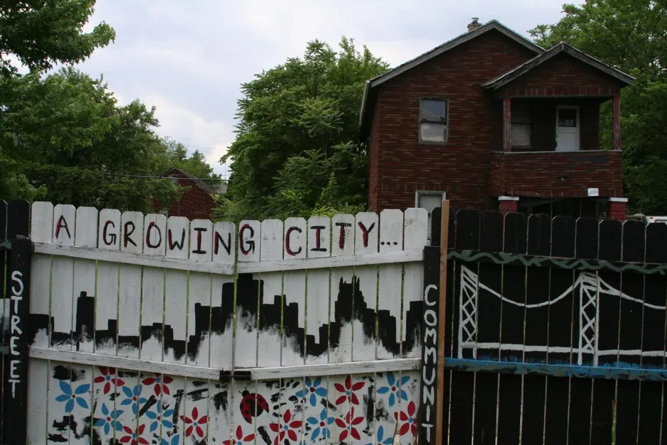 壁画见证了马克·科温顿农场的社区导向设计。杰西卡·利·赫斯特/城市实验室科温顿正在这个花园中倾注巨大的情感能量、时间和体力劳动,并与邻居建立联系。但在这个街区及其之外,还有更多的工作要做。在街的另一头,拐角处,有人把一个标志固定在一个倾倒地点。那座杂草丛生的建筑是一个房子的外壳,里面满是床垫和橡胶轮胎。标志上写着:“来自底特律的免费纪念品。请今天带一些回家。”