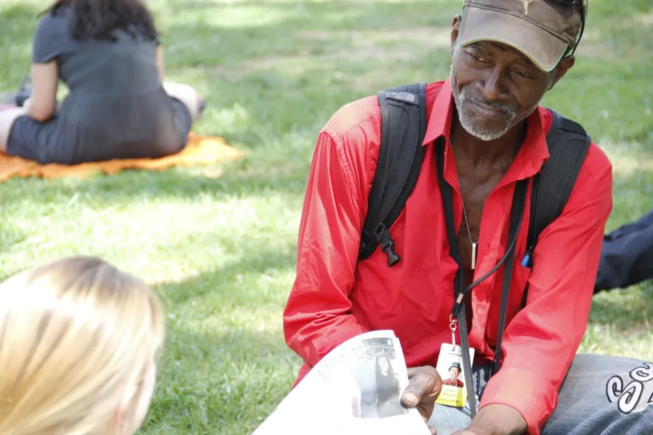 他走近一个坐在长椅上的男人。“‘你好,先生,今天过得怎么样?很抱歉打扰你……’”他给他讲述报纸的事情:售价2美元,大部分收益“帮助无家可归者自助。”这个男人用一个紧绷的微笑听着,像是在等待合适的时机说不。当威廉姆斯说完时,那个男人说他没有现金。“你完全可以给我一张空白支票、一张Visa卡,或者你的钱包,”威廉姆斯开玩笑说。那个家伙没听懂,尴尬地笑着,威廉姆斯和他击掌。