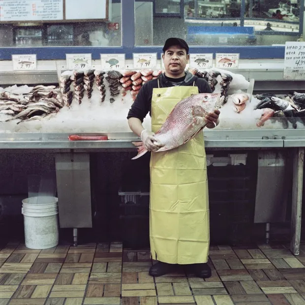 佩德罗·鲁伊斯,28岁,2016年3月在纽约市哈莱姆的海洋与海洋鱼市场里拿着一条红鲷鱼。他在市场上的一项工作是切菜,为这里准备的食物。他最喜欢的烹饪鱼的方式是“维拉克鲁斯”风格,这是一道典型的东海岸墨西哥菜。索非亚·穆尼奥斯·布尔洛萨
