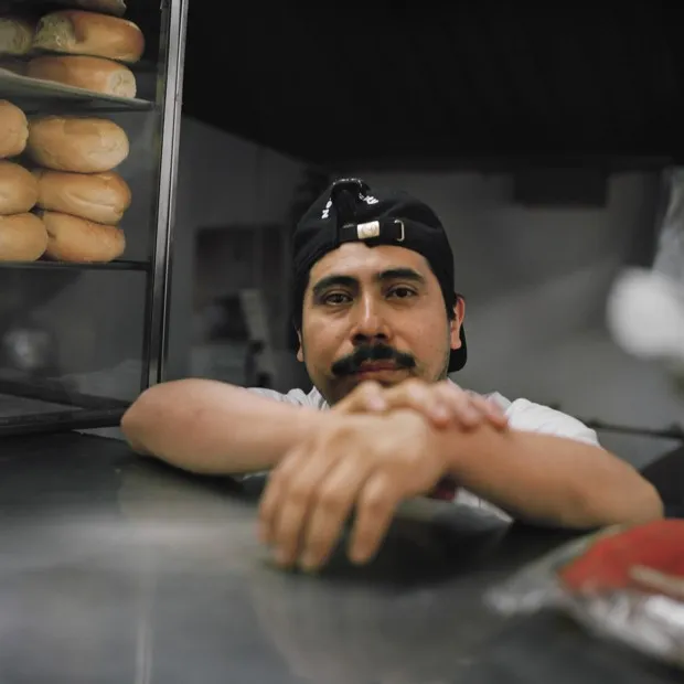 佩德罗·吉列尔莫·库里尔在纽约市美洲大道的SoHo迷你市场,2016年2月。库里尔负责处理熟食店的每日三明治订单。索菲亚·穆尼奥斯·布尔洛萨