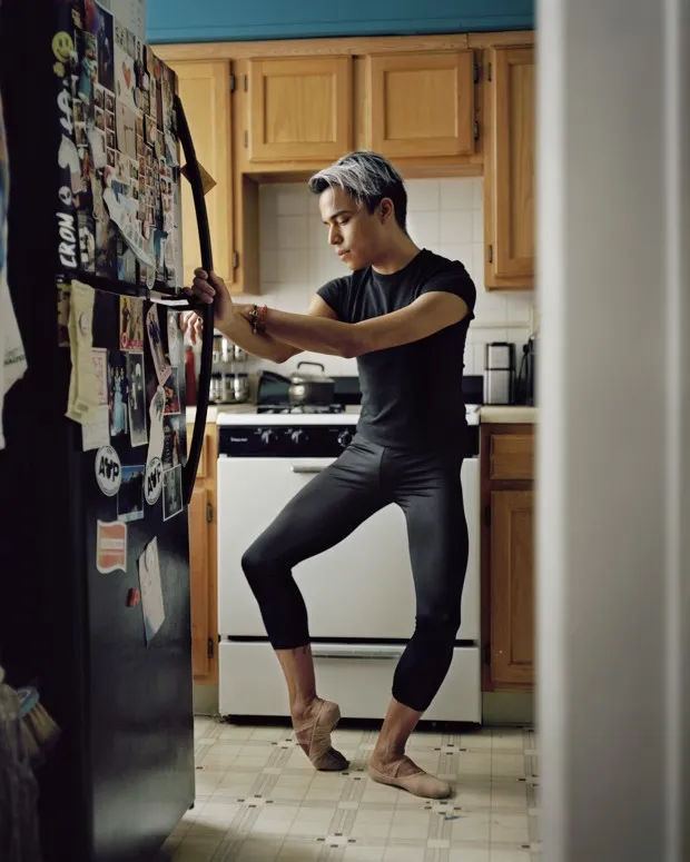佩德罗·罗德里戈·冈萨雷斯,24岁,2016年3月在新泽西州西纽约的厨房里练习芭蕾舞。冈萨雷斯是一名芭蕾舞者、个人造型师和时尚博主。他于2011年作为美国芭蕾剧院的一部分来到纽约市。索非亚·穆尼奥斯·布尔洛萨