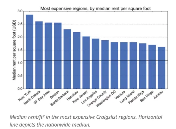 “Craigslist 符合我们对美国住房市场的地理预期,”波音写道。像纽约、旧金山和波士顿这样的城市在全国中位租金最高的城市中名列前茅(见下方柱状图)——远高于全国中位数。等等,北达科他州怎么会排在第二?正如我的同事马克·伯恩斯 在2014年所写,石油繁荣吸引了大量工人并推高了租金。
