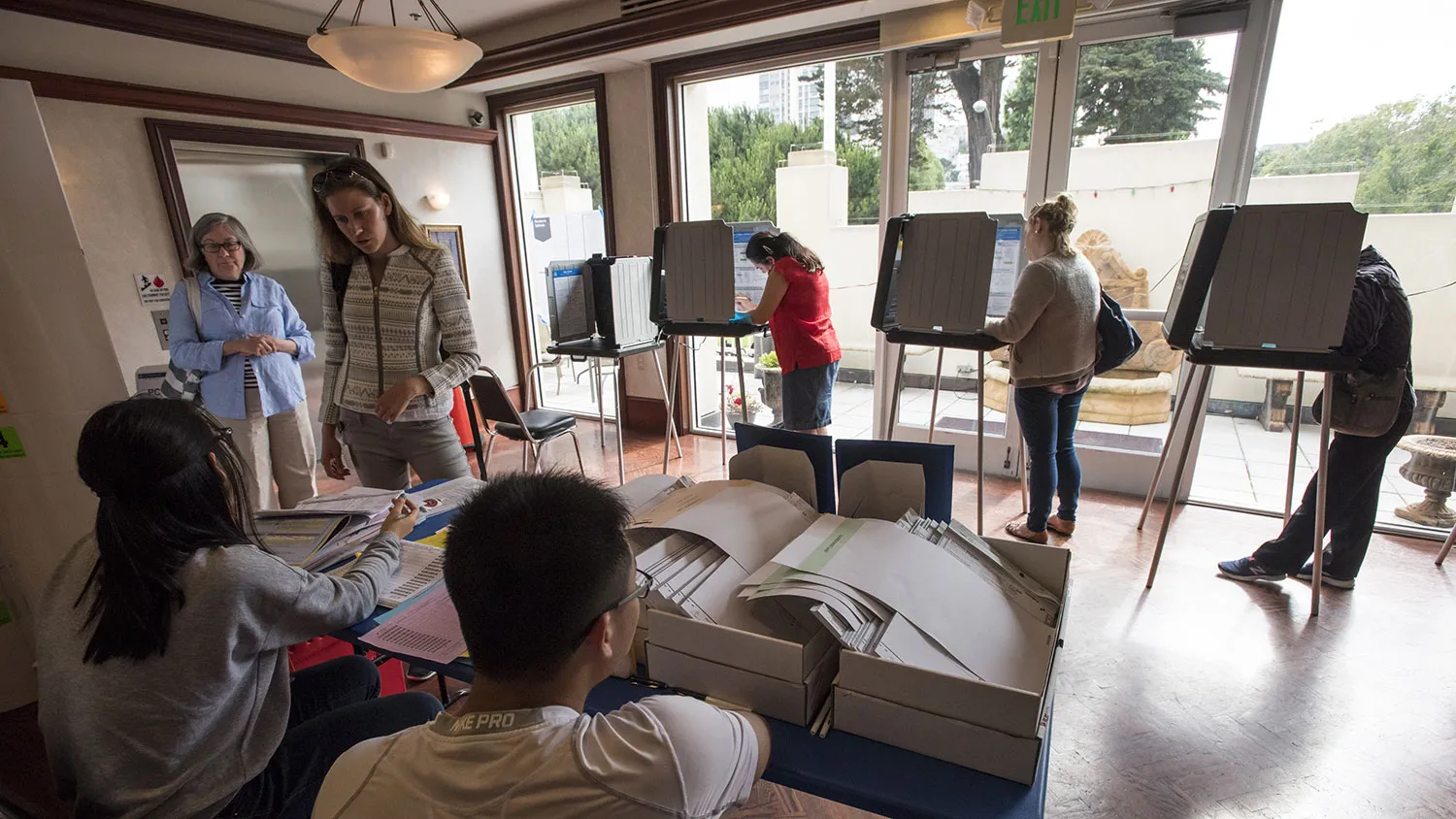 居民在2016年6月7日的旧金山总统初选中领取选票,而其他人则投票。