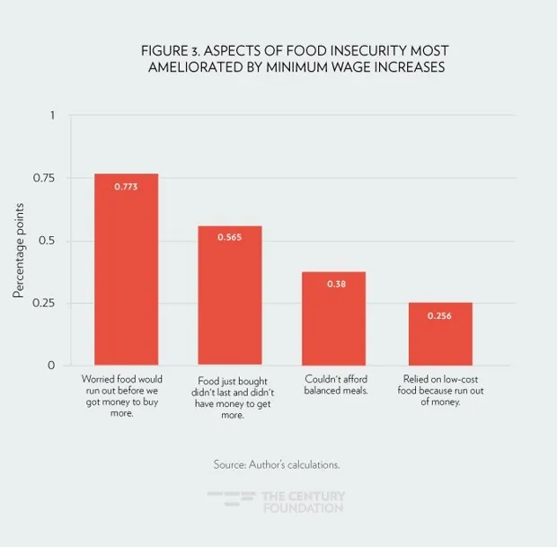 世纪基金会根据报告,“最低工资的增加可以大大减轻那些尽管工作了大量时间仍然面临食品不安全的家庭的困境。”罗杰斯的模型表明,即使是轻微的购买力增加也会减轻家庭有时被迫做出权衡在食品支出和其他必需品之间的负担。