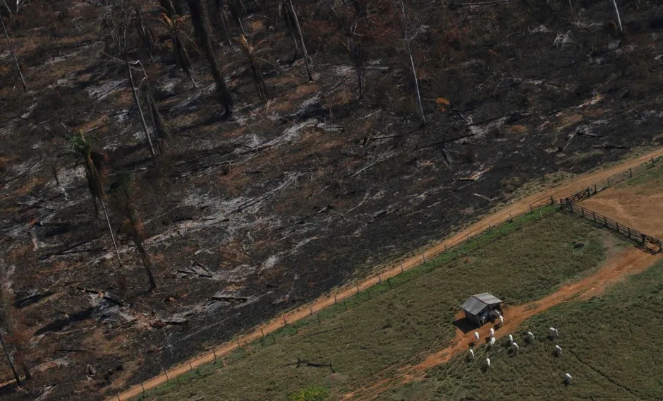 牛在2013年巴西诺沃普罗格雷索市附近的烧毁亚马逊雨林旁边吃草。纳乔·多塞/路透社想象一下一个面积相当于印度的平原,满是草、裸露的土壤和冒烟的植被残骸。这就是自1990年代初以来,人类因伐木、采矿、能源勘探、开发和其他破坏 景观破坏而赠予世界的。