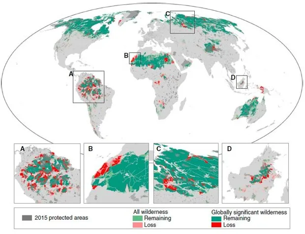 自1990年代初以来消失的大型荒野区域用红色标记。插图显示了亚马逊(A)、西撒哈拉(B)、西西伯利亚泰加(C)和婆罗洲(D)。沃森等人/当前生物学如此多的荒野被移除——“荒野”被定义为生态和生物学上完好的区域,几乎没有人类存在——根据研究人员的说法,全球仅剩下大约四分之一。世界上仍然重要的生物群落似乎位于人类尚未开发的偏远地区,例如沙漠、北极苔原和俄罗斯与加拿大广袤的针叶林。