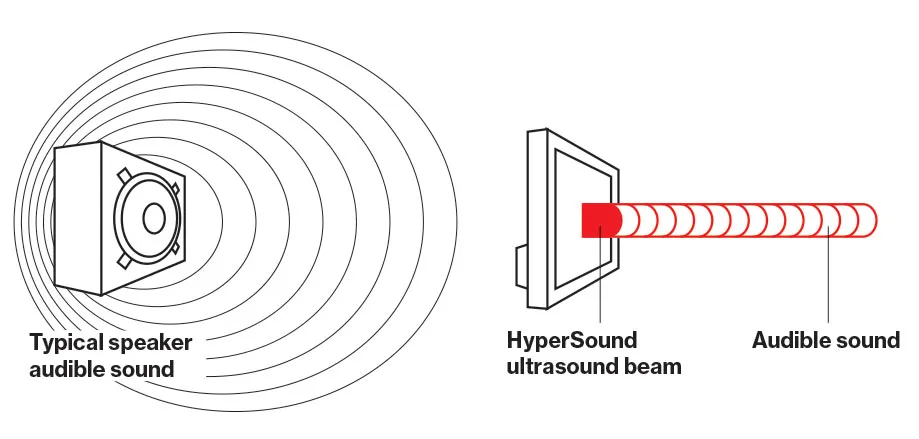 超声波的音频在位于波束路径中的听众中效果最佳。插图:7313. 转换超声波携带的音频信号在波撞击空气分子时被转换回声音,保持其聚焦方向。