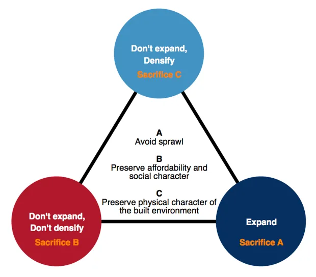 面临增长压力的城市在通过向外扩展来容纳增长与接受未能建造足够新住房的社会影响之间面临权衡。城市蔓延并不是值得欢迎的事情。但人们必须理解,如果既不向外扩展也不进行有意义的密集化,美国城市就无法提供足够的住房,以防止其社会特征发生同样不受欢迎的变化。