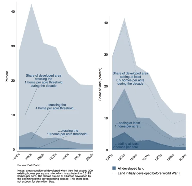第二个图表中也可以看到相同的密度下降,它追踪了通过每英亩增加0.5栋房子、一栋房子或两栋房子而开发的土地份额。同样,请注意自1950年代以来密度化的显著减少。