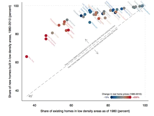 这种情况不仅在拉斯维加斯、凤凰城、亚特兰大和夏洛特等阳光带城市中存在,也在西雅图和奥斯汀等科技中心,以及底特律和克利夫兰等锈带城市中存在。纽约是其中最大的例外,但在1980年至2010年间,纽约大都会区建造的所有新住房中,仍然有近三分之二(63.8%)来自低密度开发。在高价的旧金山,同一时期开发的新住房中,近80%来自低密度开发。