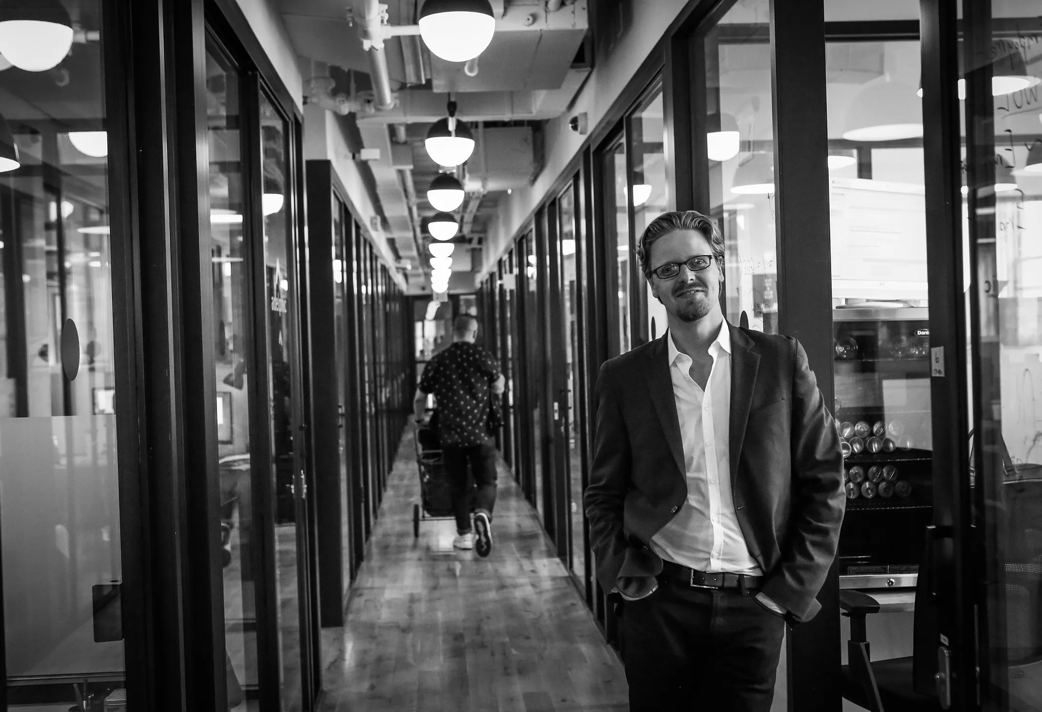 詹斯·诺德维格,Exante Data LLC的首席执行官,在纽约的平面铁区WeWork办公室。
